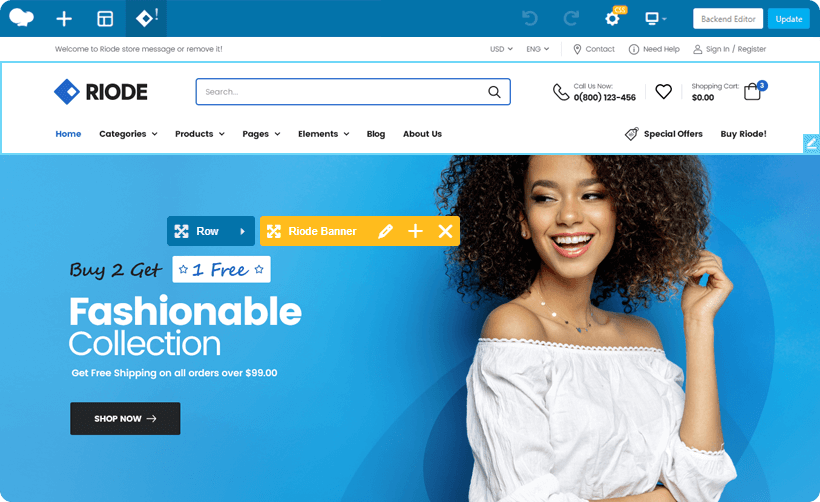 Riode works great with two remarkable page builders: WPBakery, Elementor. Please create your own